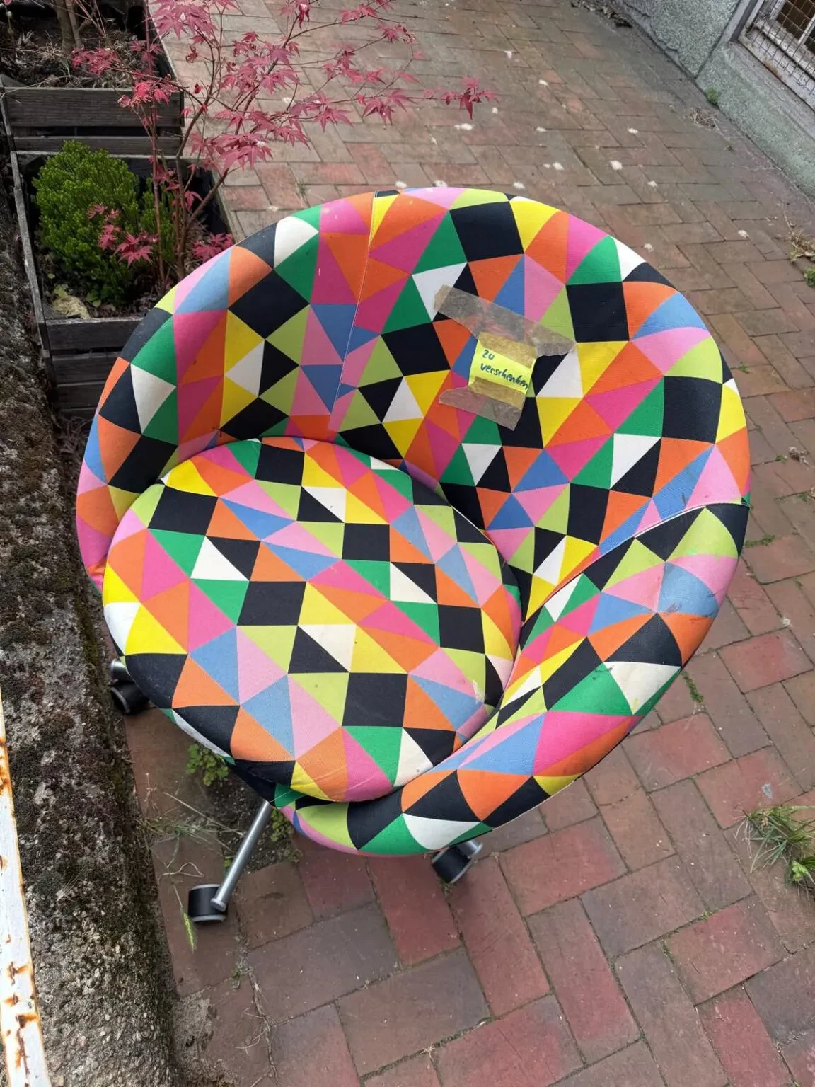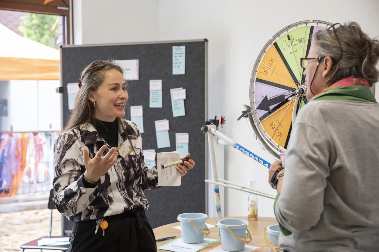 Bei uns gibt’s ein Glücksrad – mal anders: Und weil wir keine langweiligen Preise mögen, bist du bei uns eingeladen ein Armband mit deinem Mutmachspruch zu basteln. – zum Behalten, Weiterverschenken oder als kleine Erinnerung. Komm vorbei, dreh mit uns am Rad und hol dir ein Stück Zuversicht. Mit unserem bunten Sessel möchten wir für das Projekt „Krisenräume für Bremen“ werben.