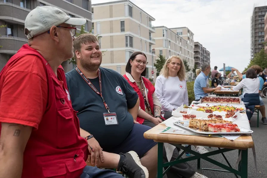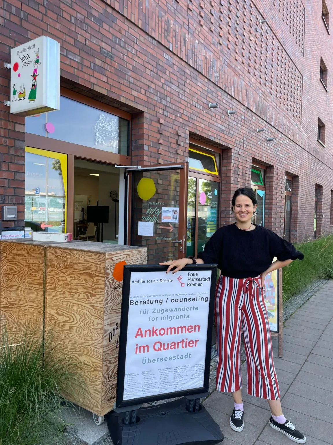 „Moin liebe Leute aus der Überseestadt! Wir von der Rotkreuz-Flüchtlingsunterkunft in der Birkenfelsstraße möchten uns bei euch vorstellen. Wir freuen uns darauf, euch kennenzulernen, und möchten euch auch die Chance geben, uns kennenzulernen. Falls ihr Fragen oder Anregungen habt, sind wir heute gerne für euch da. Schaut gerne auf ein Stück Kuchen bei uns vorbei! Euer Team vom Deutschen Roten Kreuz Birkenfelsstraße“
