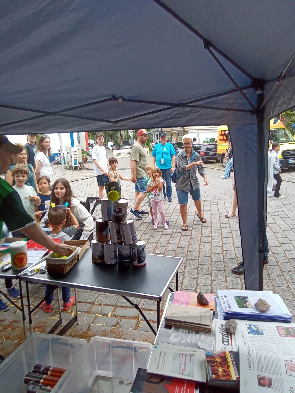 Die Vereinigung der Verfolgten des Naziregimes – Bund der Antifaschistinnen (VVN-BdA)* ist ein überparteilicher Zusammenschluss von Verfolgten des Naziregimes, Widerstandskämpferinnen und Antifaschistinnen aller Generationen. Unsere Aktion beim Picknick „Zu Tisch“. Wir bringen unser beliebtes „Abrüst-Spiel“ mit: Zehn Dosen, beklebt mit Bildern von Panzern und anderen Kriegsgeräten, werden zu einer Pyramide gestapelt. Ziel ist es, diese mit Tennisbällen „abzurüsten“. Kinder und Erwachsene sind dazu eingeladen abzurüsten, wer erfolgreich abrüstet, bekommt einen Button oder Aufkleber.