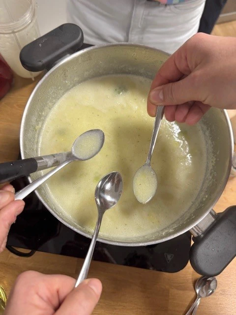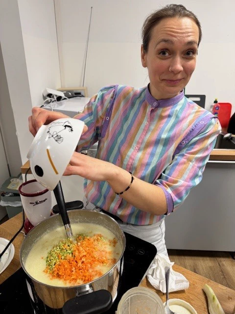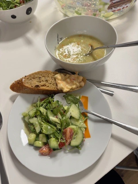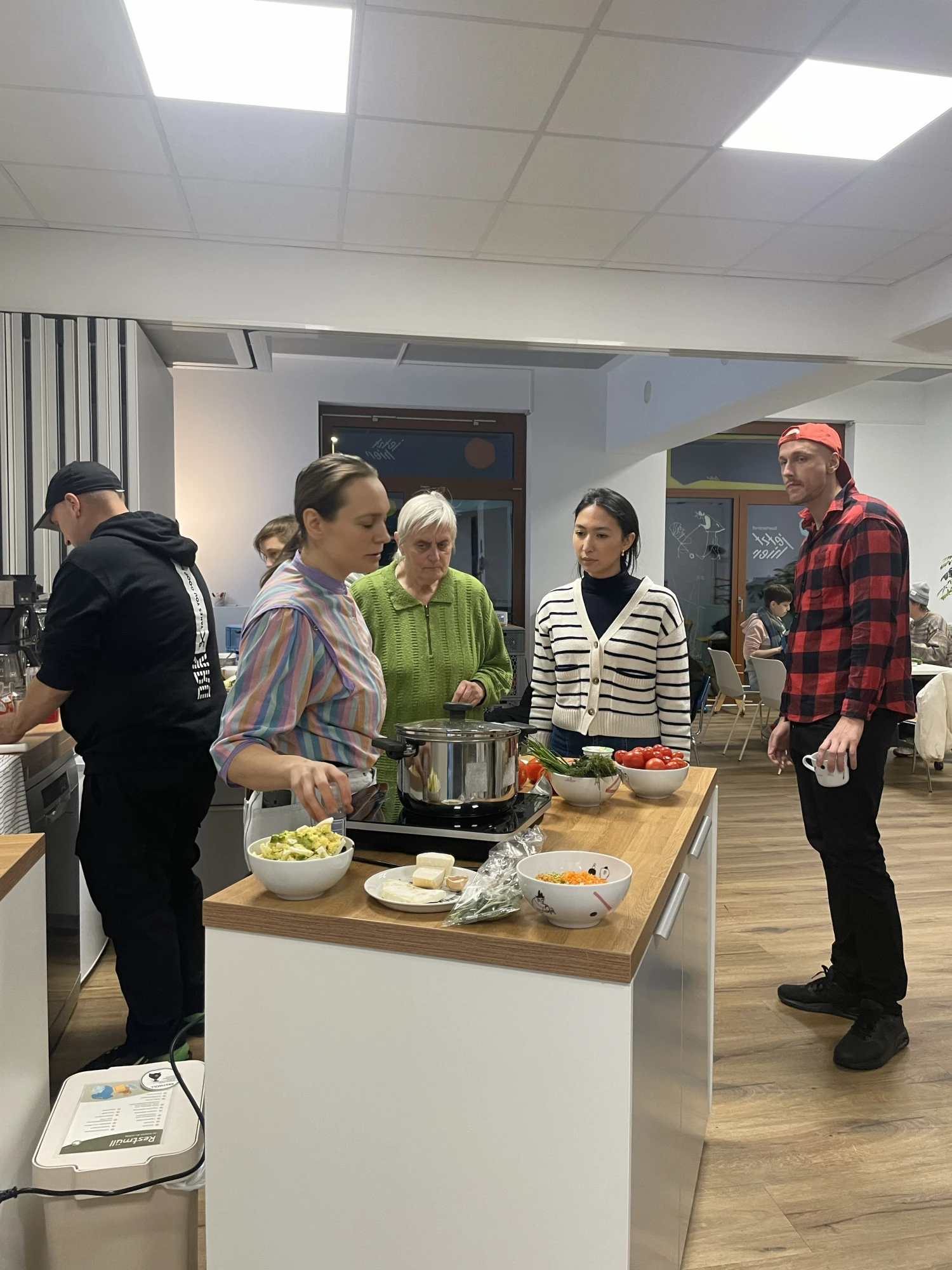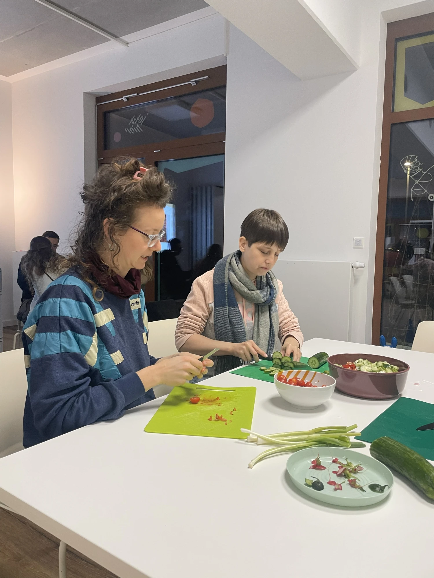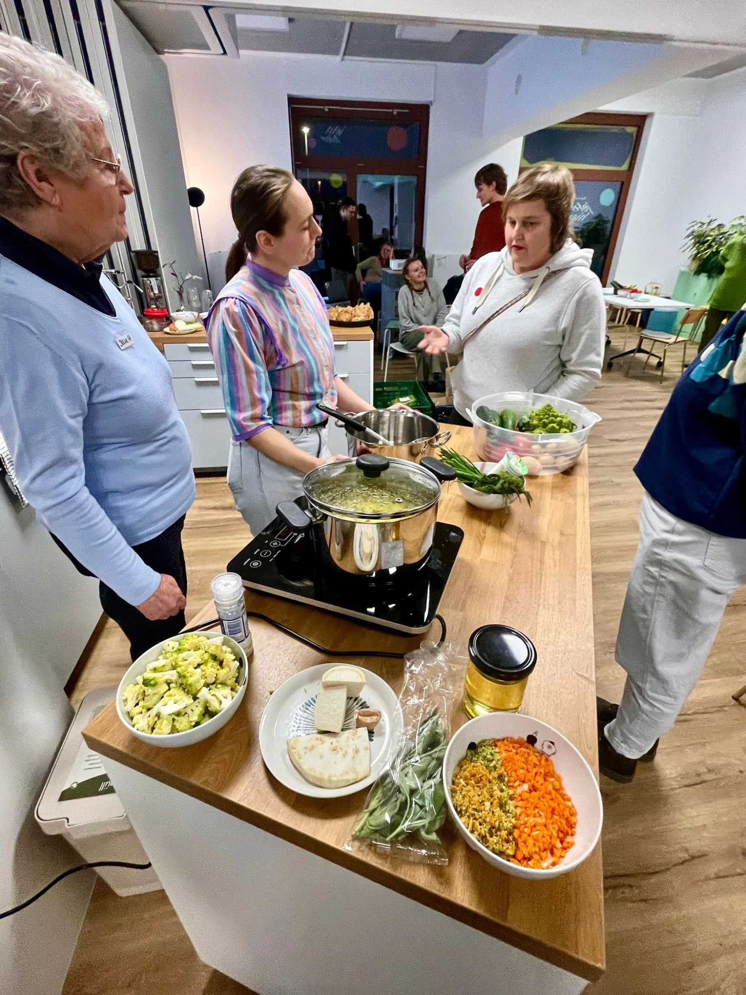 Ein besonderes Highlight war der praktische Teil der Veranstaltung: Katarzyna von Second Plant leitete eine Kochaktion mit geretteten Lebensmitteln aus dem Fairteiler. Gemeinsam wurde ein veganes Menü gezaubert, geschnibbelt, gekocht und direkt probiert.