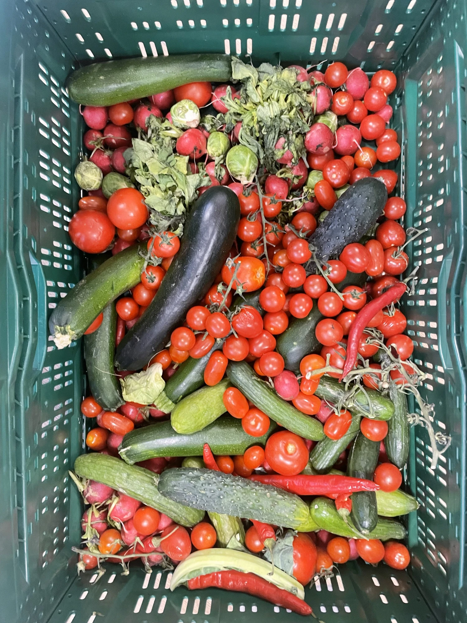 Der Abend stand unter dem Motto Foodsharing und Lebensmittelverschwendung. Schon beim Betreten des Raums fielen die Kisten mit gerettetem Gemüse wie Zucchini, Tomaten, Gurken oder Kartoffeln ins Auge – ein kleiner Vorgeschmack auf das Mini-Tasting, das noch folgen sollte.